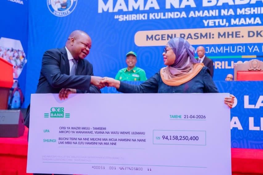 Rais wa Jamhuri ya Muungano wa Tanzania, Mhe. Dkt. Samia Suluhu Hassan akimkabidhi Waziri wa Nchi, Ofisi ya Waziri Mkuu, Tawala za Mikoa na Serikali za Mitaa (TAMISEMI) Profesa Riziki Shemdoe mfano wa hundi ya Shilingi bilioni 94.158,250,400/= kwa ajili ya mikopo ya Wanawake, Vijana na Watu wenye Ulemavu kwenye Kongamano la Kitaifa la Mama na Baba lishe, lililofanyika katika Kituo cha Mikutano cha Kimataifa cha Julius Nyerere (JNICC), Jijini Dar es Salaam, tarehe 21 Aprili, 2026